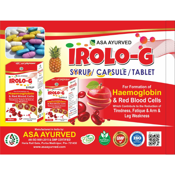 ASA AYURVED IROLO-G SYRUP/CAPSULE/TABLET FOR FORMATION OF HAEMOGLOBIN & RED BLOOD CELL, WHICH CONTNBUTE TO THE REDUCTION OF TIREDNESS,FATIQUE & ARM & LEH WEAKNESS.